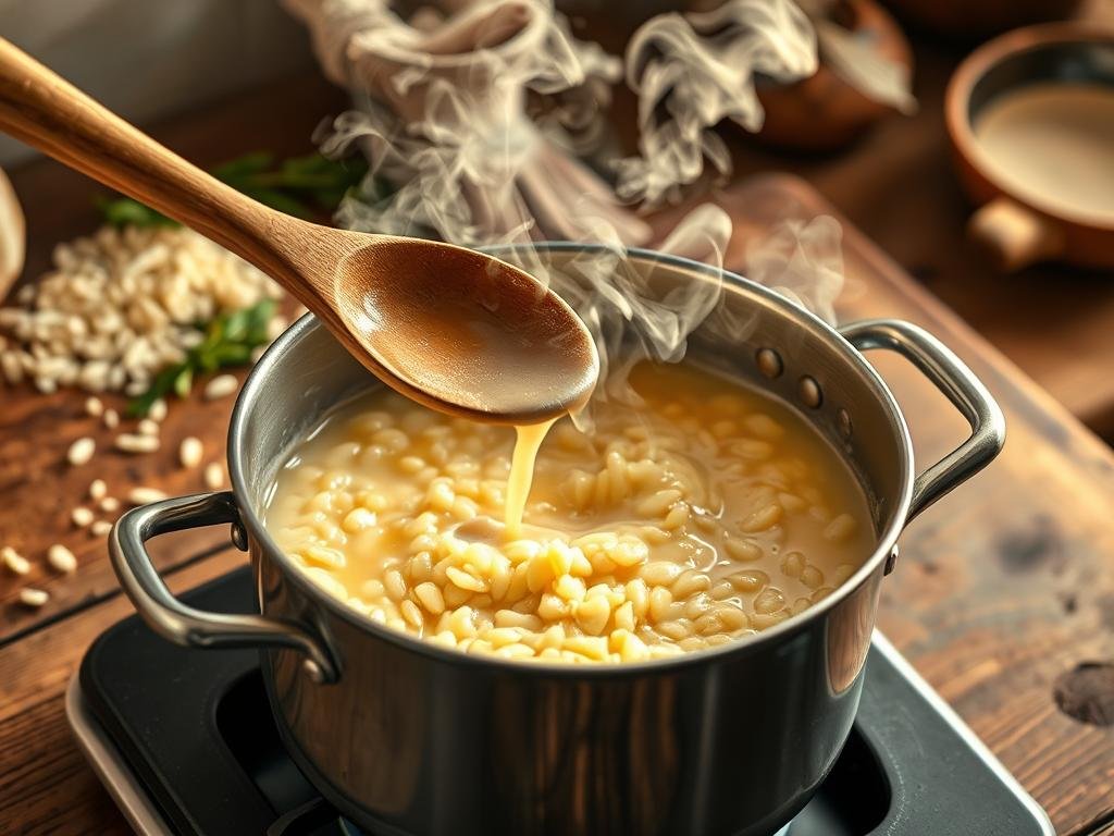 - Gradually add warm broth, one ladle at a time, stirring frequently to release the starch and achieve creaminess.