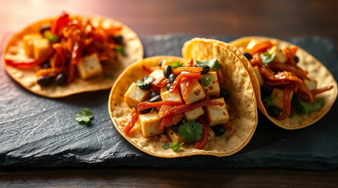 Keywords: tofu tacos, vegan, Korean fusion, black beans, kimchi