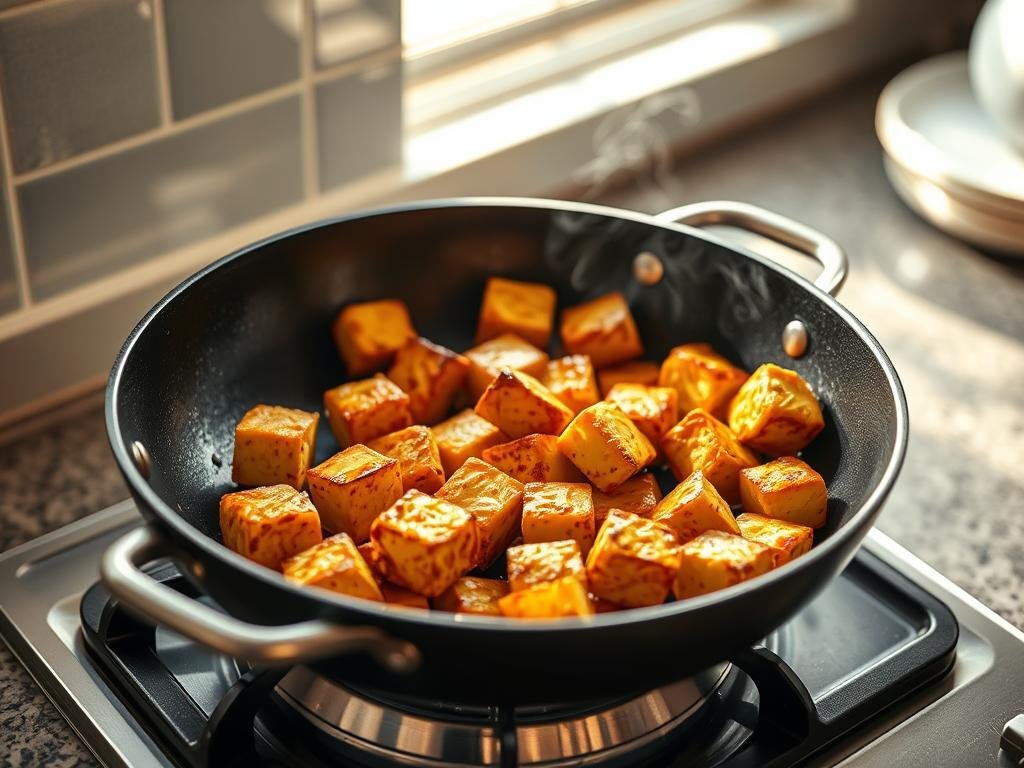 3. Heat a non-stick skillet over medium-high heat and add a bit of oil. Once hot, add the marinated tofu cubes in a single layer. Fry on each side for about 4-5 minutes until golden brown and crispy.