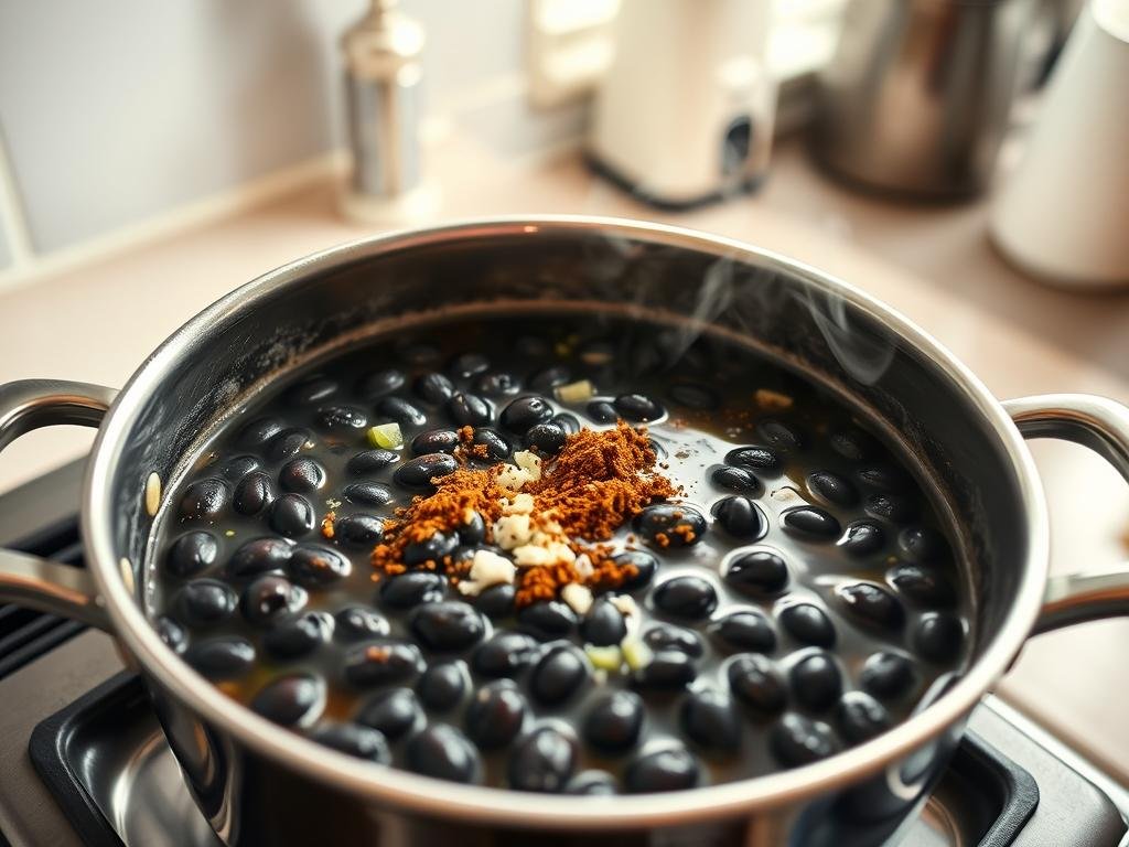 4. Combine canned black beans (drained and rinsed) in a saucepan with minced garlic, cumin, a pinch of salt, and a splash of lime juice. Heat over medium until warmed through, about 5-7 minutes.