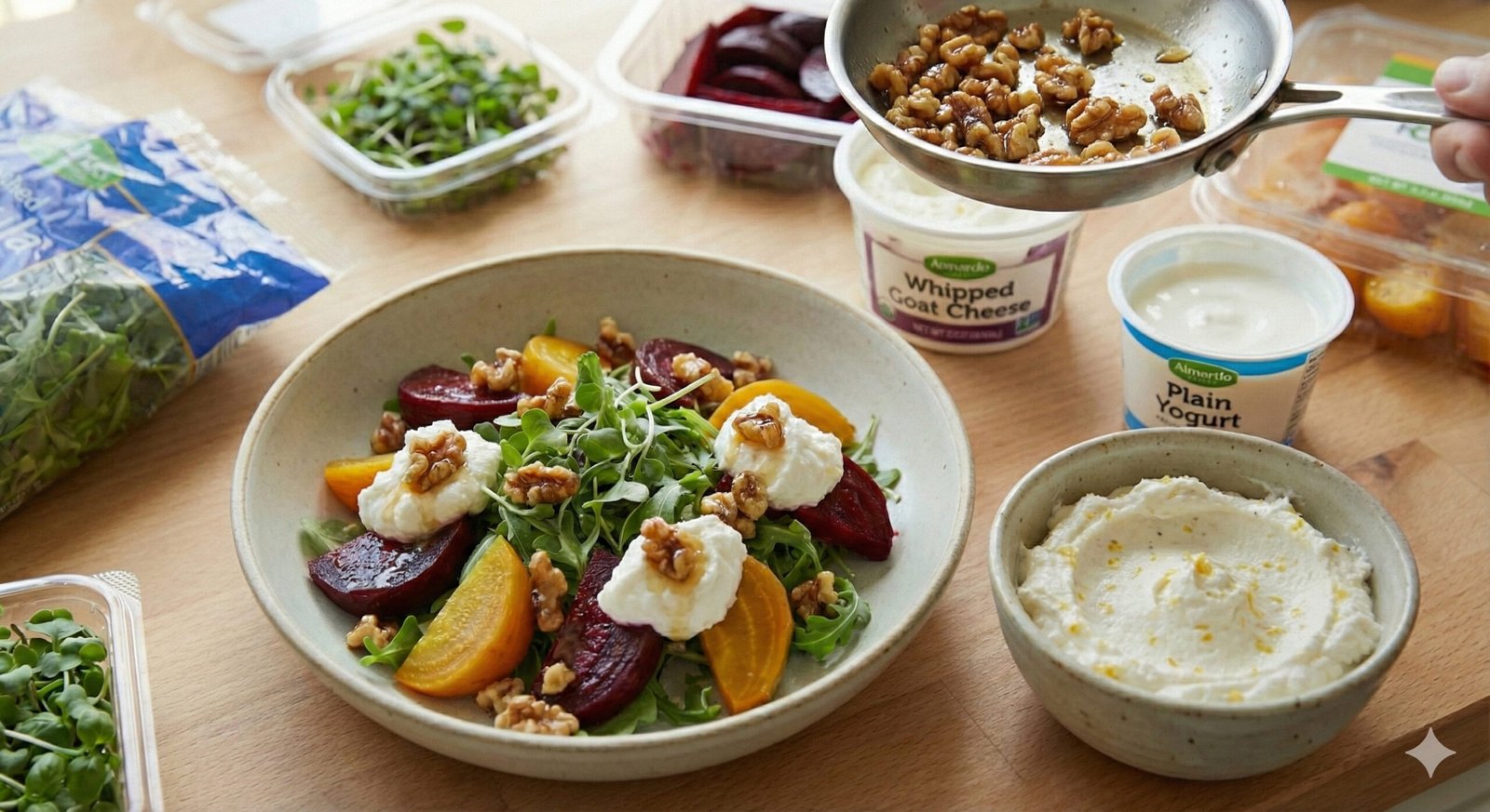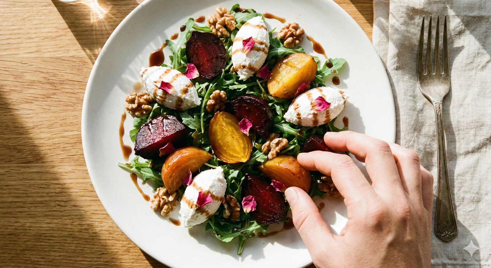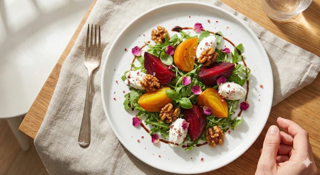 A vibrant bowl of roasted beets, whipped goat cheese, honey-kissed walnuts, and a whisper of balsamic-rose—crafted the way I like best: with heart, memory, and a touch of quiet magic.