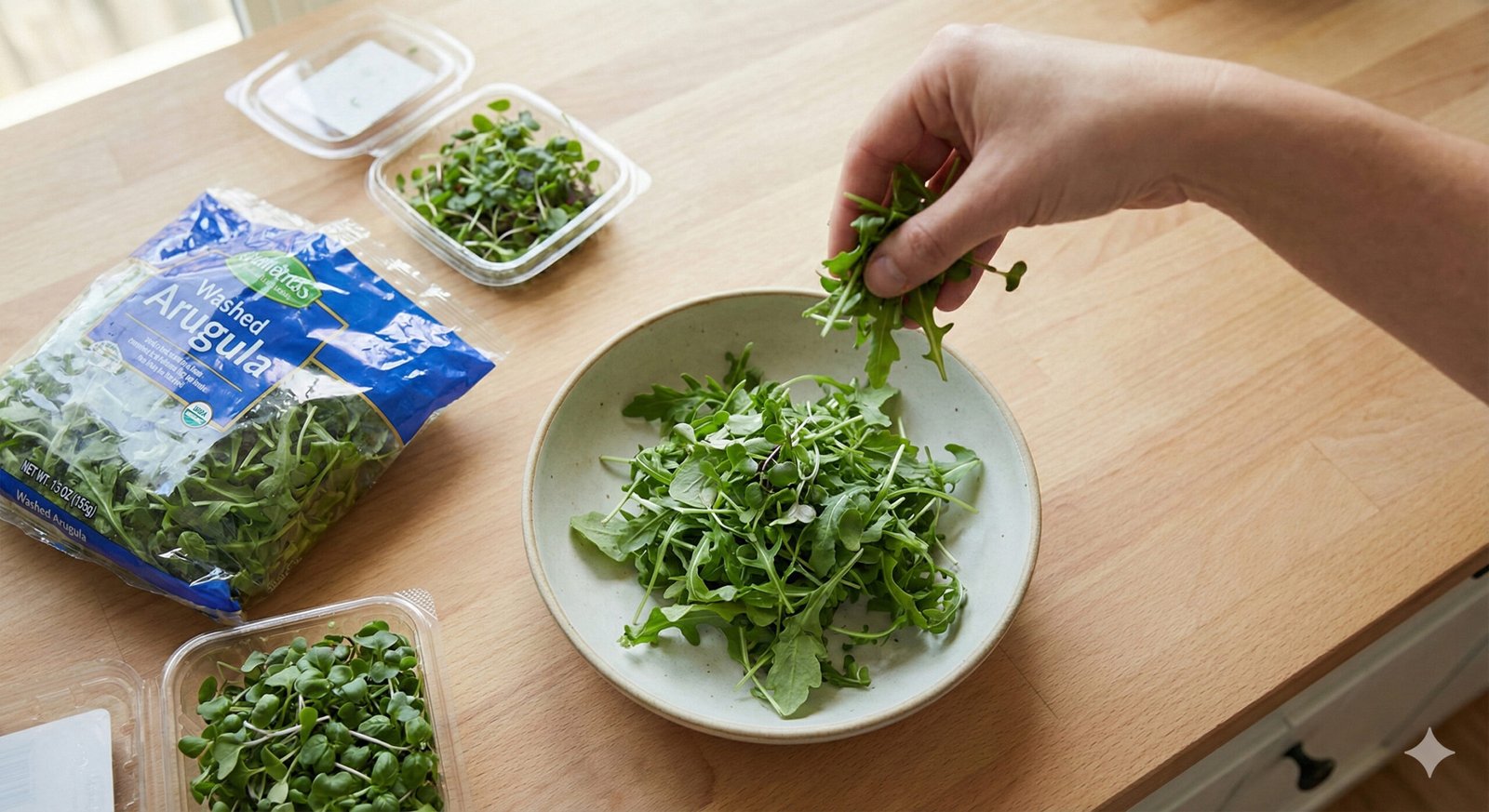 Take a handful of pre-washed arugula and let it fall onto the plate—no arranging, no perfectionist thoughts.