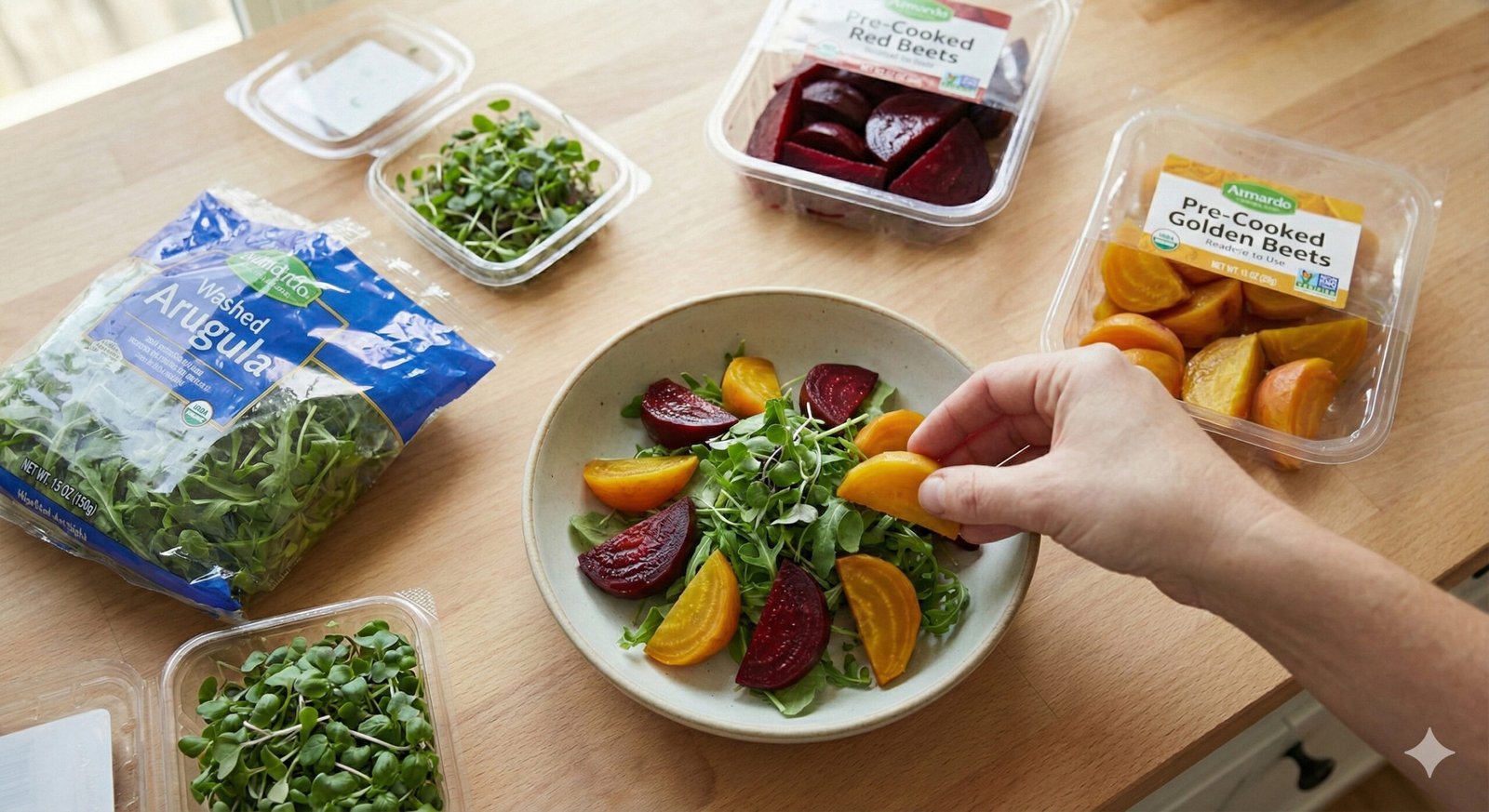 Since we’re working with pre-cooked red and golden beets, there’s no scrubbing, peeling, or roasting required—the hard work is already done for you.
