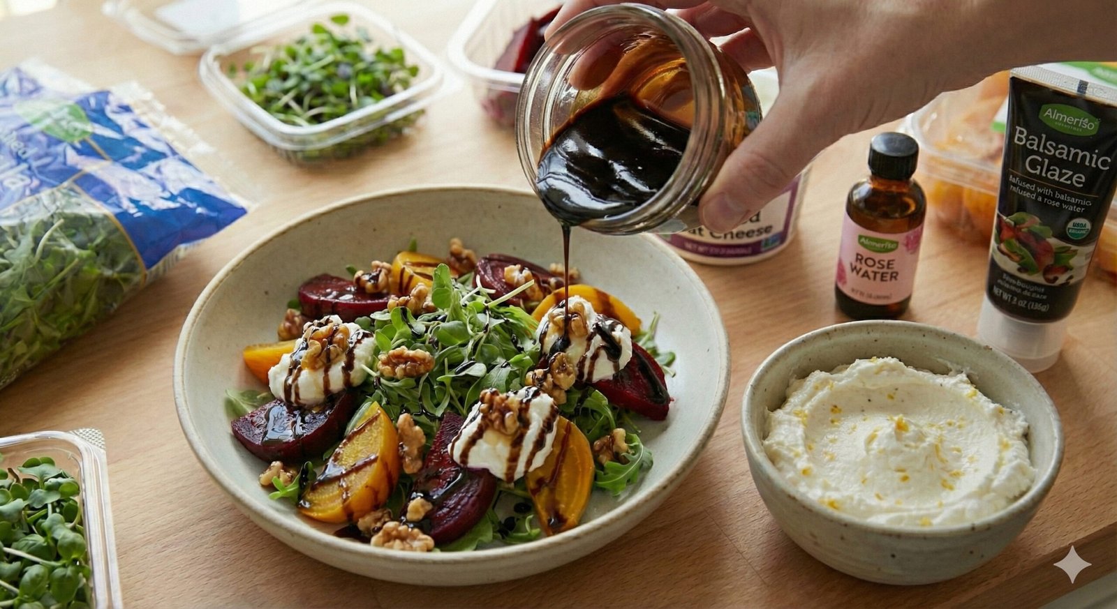 The final touch, the flourish I never skip, is the balsamic-rose drizzle. Balsamic from Modena, the pride of my region, married with the perfume of rose water—an unexpected combination that somehow tastes like renewal itself. When it kisses the warm beets and the cool goat cheese, everything settles into balance.