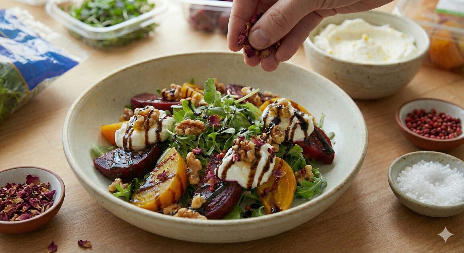 And if you’ve ever cooked with me, you know: presentation is not decoration. It’s storytelling. The red and golden beets shine like gems. The goat cheese rests like a small white cloud. The arugula and micro basil add that peppery snap that wakes the senses. Then the rose petals, the pink pepper, the Maldon crystals—each one a finishing whisper that says: don’t rush; savor this moment.