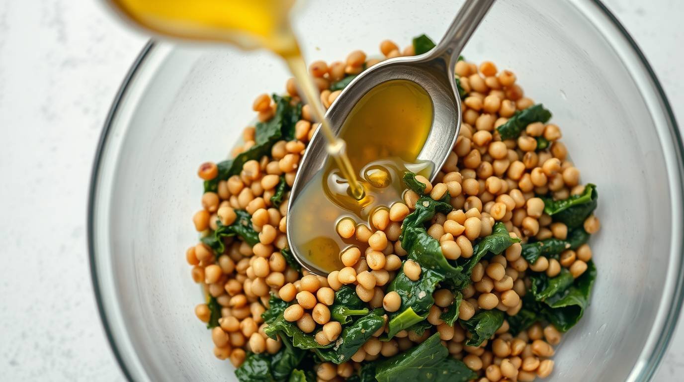 The final touch is the lemon-mustard dressing, which is whisked together separately and then drizzled over the warm lentil and spinach mixture. This technique ensures that the dressing coats each ingredient evenly, allowing the flavors to meld beautifully.