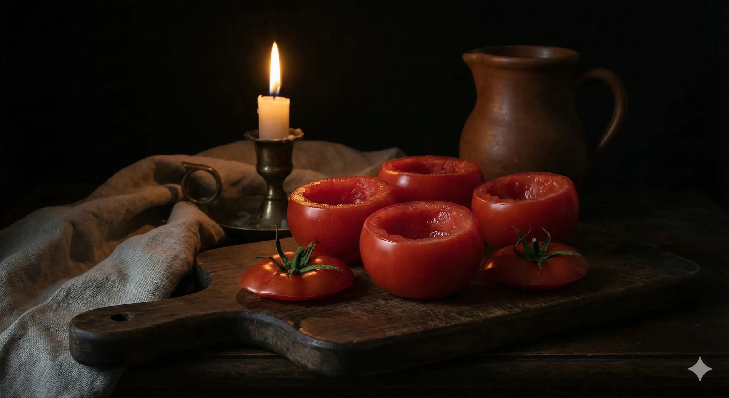 Marco first tasted a version of this dish during a private dinner he once cooked for an elderly British historian who lived in Napa but insisted her dining room be “properly candlelit at all times.” She loved Downton Abbey and claimed that Lady Violet would approve of nothing less than perfectly hollowed tomatoes, “like little red chambers ready to hold a secret.”