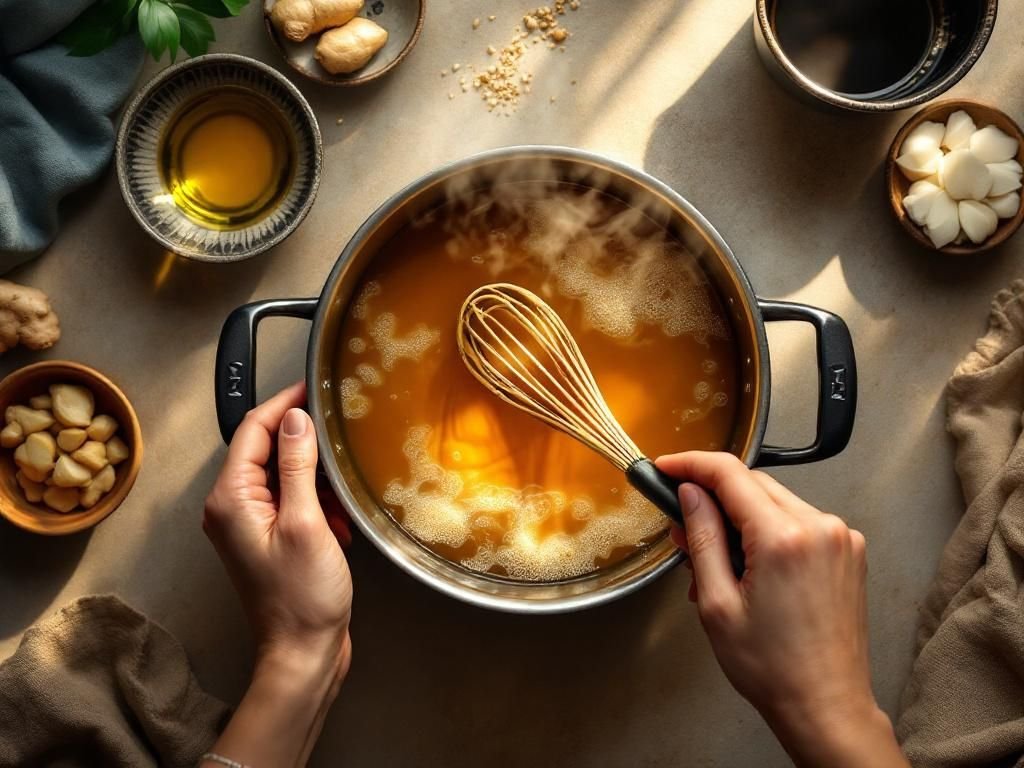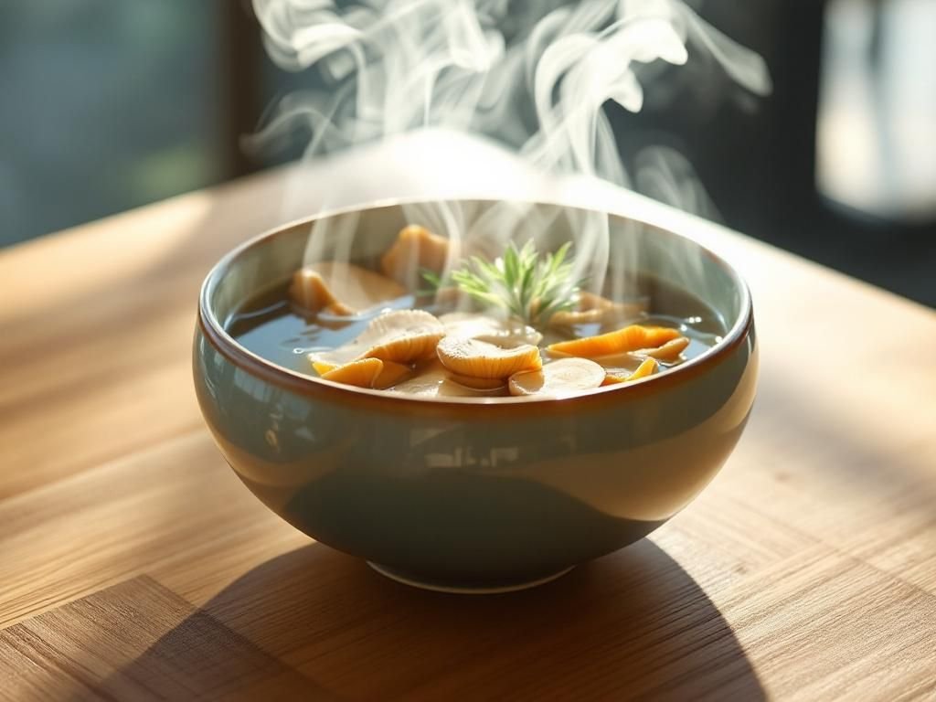 Simmer kombu and shiitake for 15 minutes. Remove solids, then add miso, tamari, ginger, garlic, and sesame oil.Stir gently—do not boil—to preserve miso’s probiotic essence.