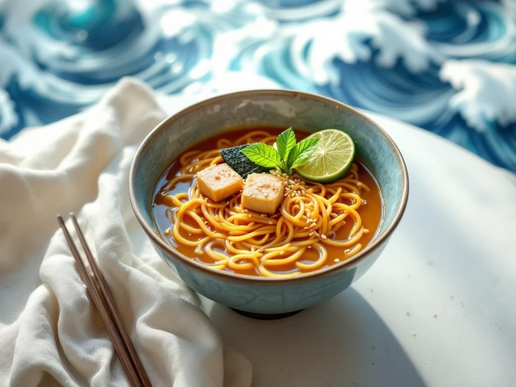 Throughout history, Japanese cuisine has placed a strong emphasis on seasonal ingredients and the balance of flavors. Oceanic Ramen with Tofu Pearls and Nori Foam respects this tradition by incorporating fresh, wholesome components that align with these principles. The use of tofu, a versatile protein that originated in China over 2,000 years ago, reflects the cross-cultural exchange that has enriched Japanese culinary practices. Its inclusion in this recipe adds a subtle creaminess, complementing the briny notes of the sea.