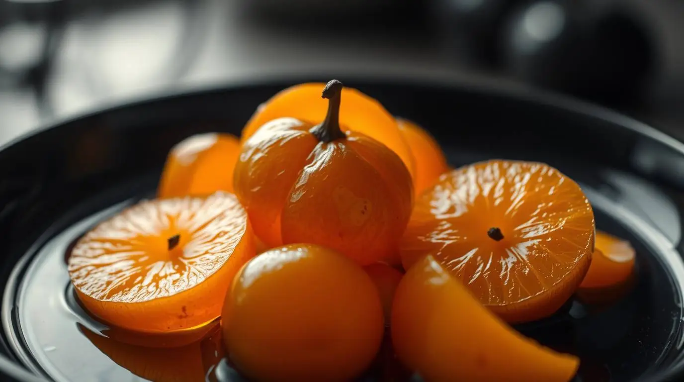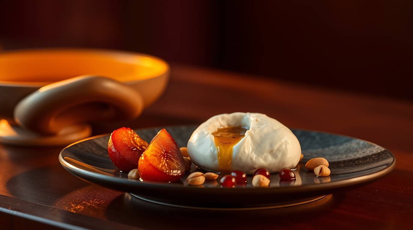 For the saffron-poached quince with burrata, begin by peeling and coring two quinces, slicing them into wedges. In a saucepan, combine 500ml of water, 100g of sugar, a pinch of saffron threads, and a strip of lemon zest. Bring to a gentle simmer, allowing the saffron to infuse the liquid with its golden hue. Submerge the quince wedges into the saffron syrup, covering with a parchment paper lid to ensure even poaching. Simmer gently on low heat for 45 to 60 minutes, or until the quince becomes tender and imbued with a rich, amber color. As the quince softens, the saffron imparts not only color but a subtle, earthy warmth, transforming the fruit into a fragrant delight. Remove the poached quince from the syrup and set aside. Reduce the poaching liquid over medium heat until it becomes a glossy, aromatic glaze. This reduction will serve as a bridge between the quince and burrata, enhancing the dish with a concentrated burst of flavor. For plating, place a portion of burrata in the center of each serving dish, allowing its creamy texture to act as a canvas. Nestle a few pieces of poached quince alongside the burrata, then drizzle with the saffron glaze. Finish with a sprinkle of toasted pistachios for a touch of crunch and a hint of salt to balance the sweetness. To serve, present the dish with a flourish, encouraging diners to break into the burrata, releasing its luscious interior. The experience is one of contrast: the cool creaminess of the cheese against the warmth of the spiced quince, a harmonious dance of flavors and textures.