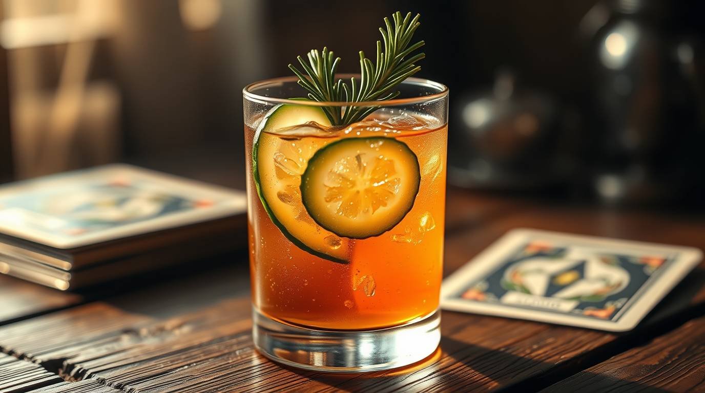 A refreshing and mystical cocktail combining gin, lemon, rosemary syrup, and cucumber for a drink that symbolizes clarity and fresh beginnings.