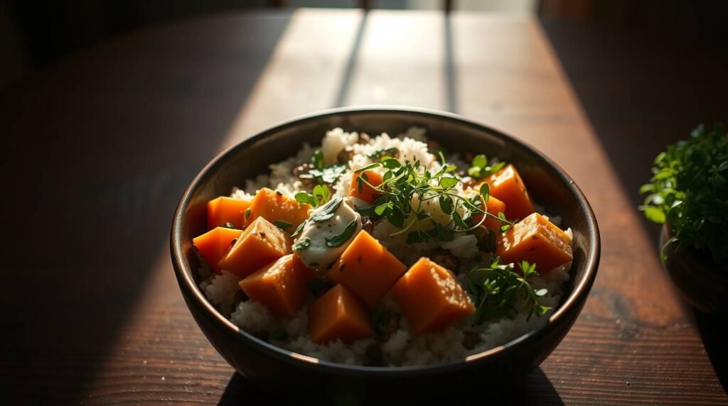 Cook 1 cup of brown rice in 2 cups of water with a pinch of sea salt. Let it steam off-heat for 10 minutes for fluffiness.Brown rice forms the steady backbone of the dish with its slow-digesting carbs and gentle impact on blood sugar.