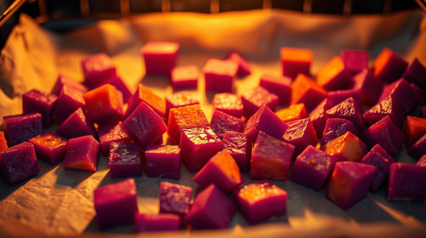 Cube 1 medium purple sweet potato. Toss with olive oil and a pinch of sea salt. Roast at 400°F (205°C) for 25 minutes until caramelized.Purple sweet potatoes bring anthocyanin power, supporting mitochondria, nerve repair, and emotional calm.