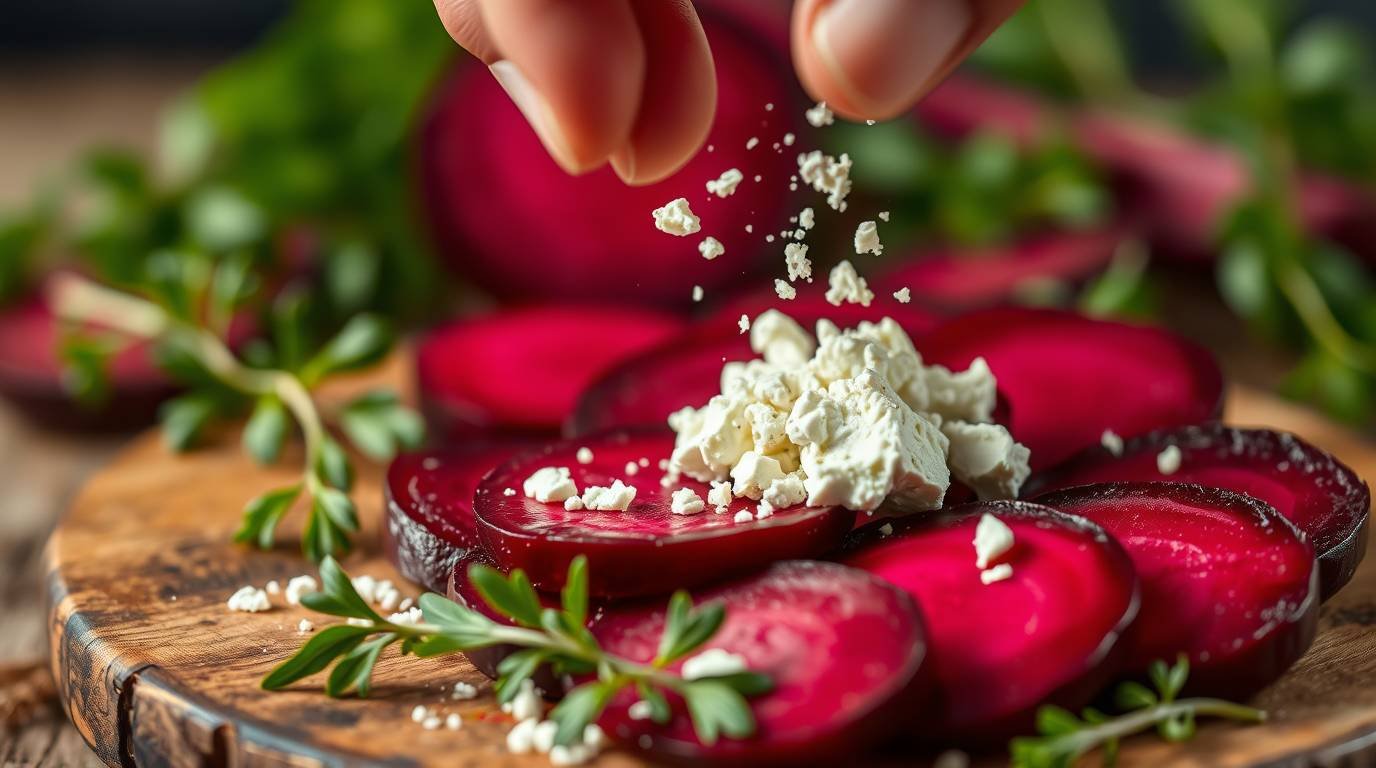 Crumble the goat cheese over the arranged beet slices generously. The creamy tang of the cheese complements the earthy beets wonderfully.