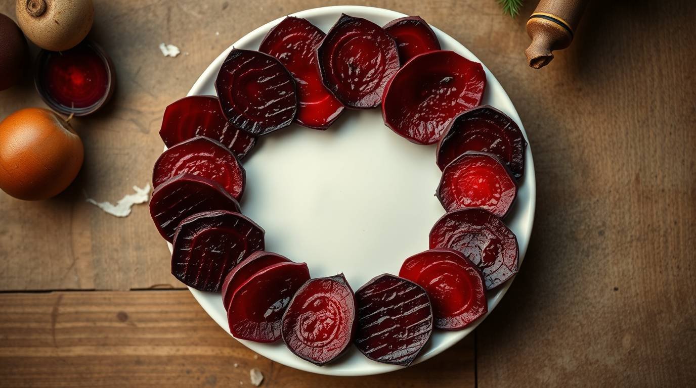 On a large serving plate or a wooden board, arrange the beet slices in a single layer, slightly overlapping them to create a beautiful pattern.