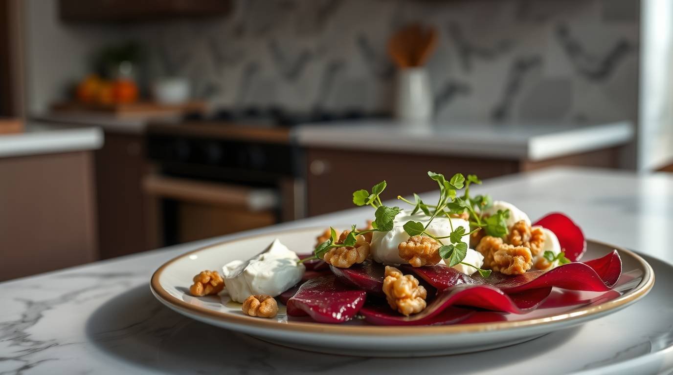 How to Make Roasted Beet Carpaccio with Goat Cheese, Walnuts & Microgreens
