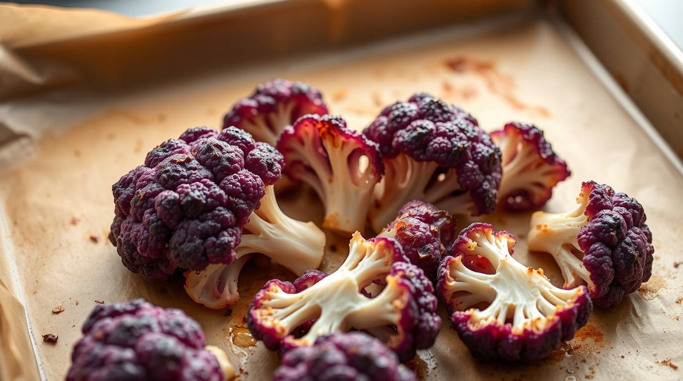 Begin by cutting the purple cauliflower into small florets, about 1 to 2 inches in size. This allows for even roasting and better flavor absorption.