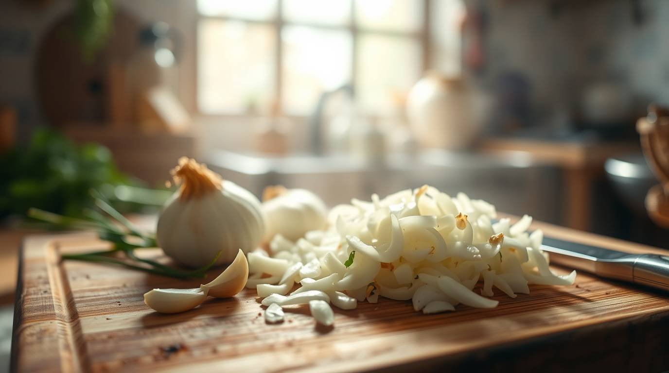 Chop 1 medium onion and 2 cloves of garlic. These will bring a wonderful depth to your soup.Don’t be shy with the garlic—it's what makes it aromatic! -