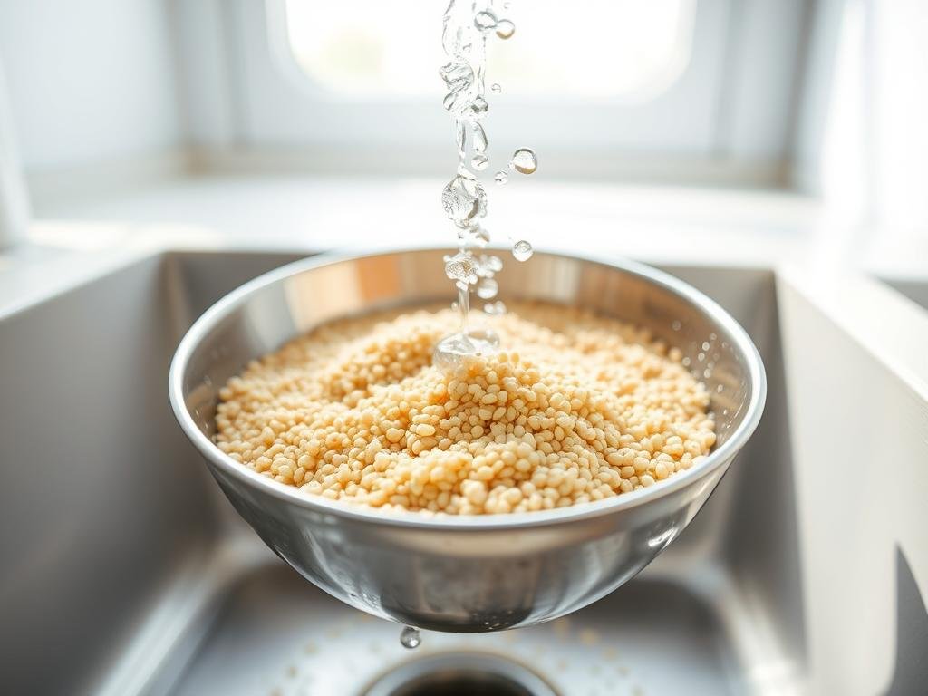 Start by rinsing 1 cup of quinoa under cold water for about 2 minutes. This helps remove the natural coating, called saponin, which can give a bitter taste.Make sure to use a fine-mesh strainer to catch all the tiny grains. -