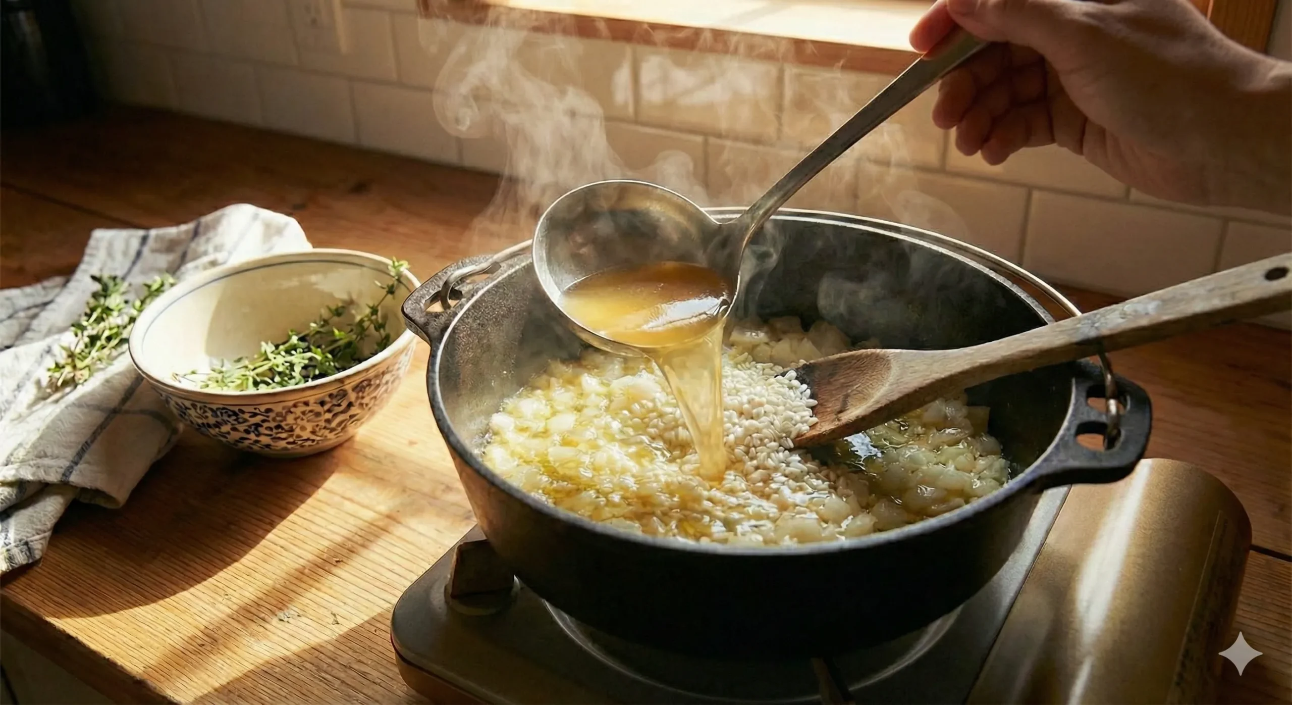 - Gradually add warm broth, one ladle at a time, stirring continuously to release starch.